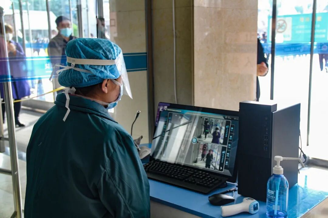 门诊入口处设有一台专门用于检测体温的红外筛检仪,所有进入楼的患者从此经过后体温都会在监控屏上显示,出现发热仪器会自动报警,监控人员通过设备可以快速甄别发热患者。